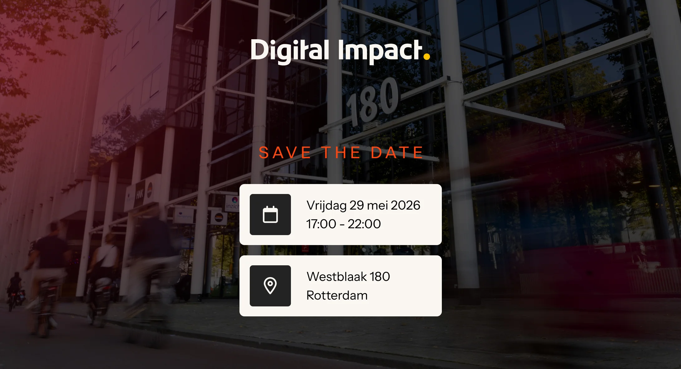 Op vrijdag 29 mei opent Digital Impact opnieuw haar deuren tijdens Agency at Night – en dit jaar wordt er één om niet te missen. Agency at Night is hét moment waarop agencies door heel Nederland laten zien wie ze zijn, waar ze voor staan en hoe ze werken. Ook bij Digital Impact geven we een exclusieve inkijk in onze wereld: van strategie tot creatie, van campagnes tot cultuur.